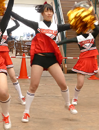 スカートがめくれて、右側のチア女子二人のスカートの中身が見えます。